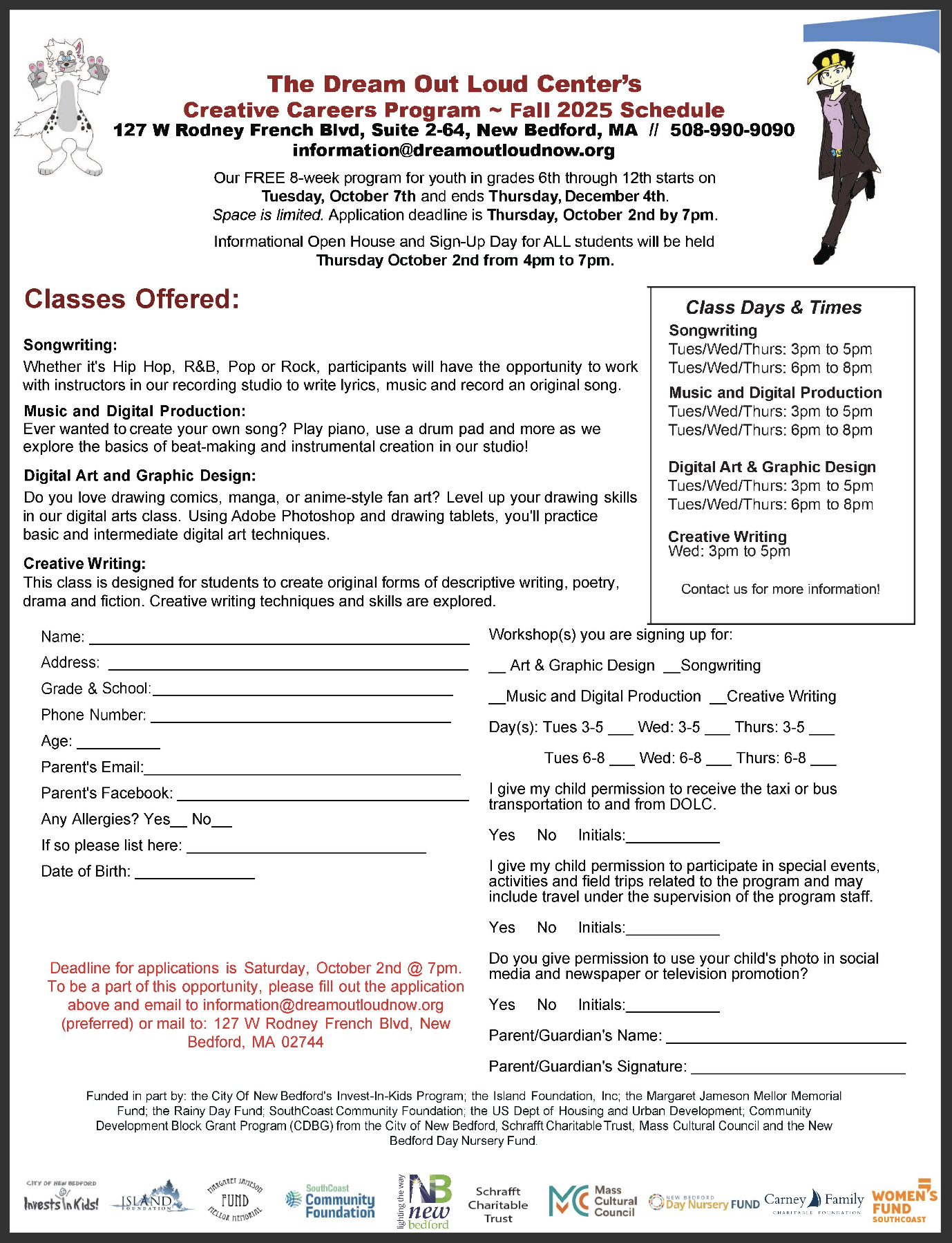 Dream Out Loud is a wonderful community program currently recruiting students for their FREE Fall Creative Careers Program for middle and high school youth who are interested in songwriting, digital music production, creative writing, digital art and graphic design. Classes start on October 7, 2025 and are held on Tuesdays, Wednesdays and Thursdays from 3:00pm - 5:00pm, and 6:00pm - 8:00pm through December 4th. Dream Out Loud is located at the Kilburn Mill, 127 West Rodney French Blvd in New Bedford.