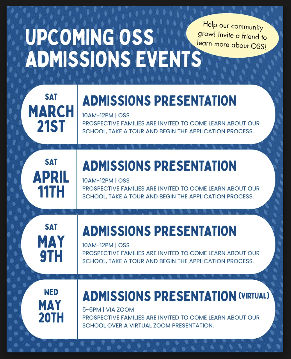Wed. March 25 ~ Required Family Meeting; OSS will provide child care so the meeting is focused and we’ve got one staff member available for the task. Please pre-register so we can be best prepared.