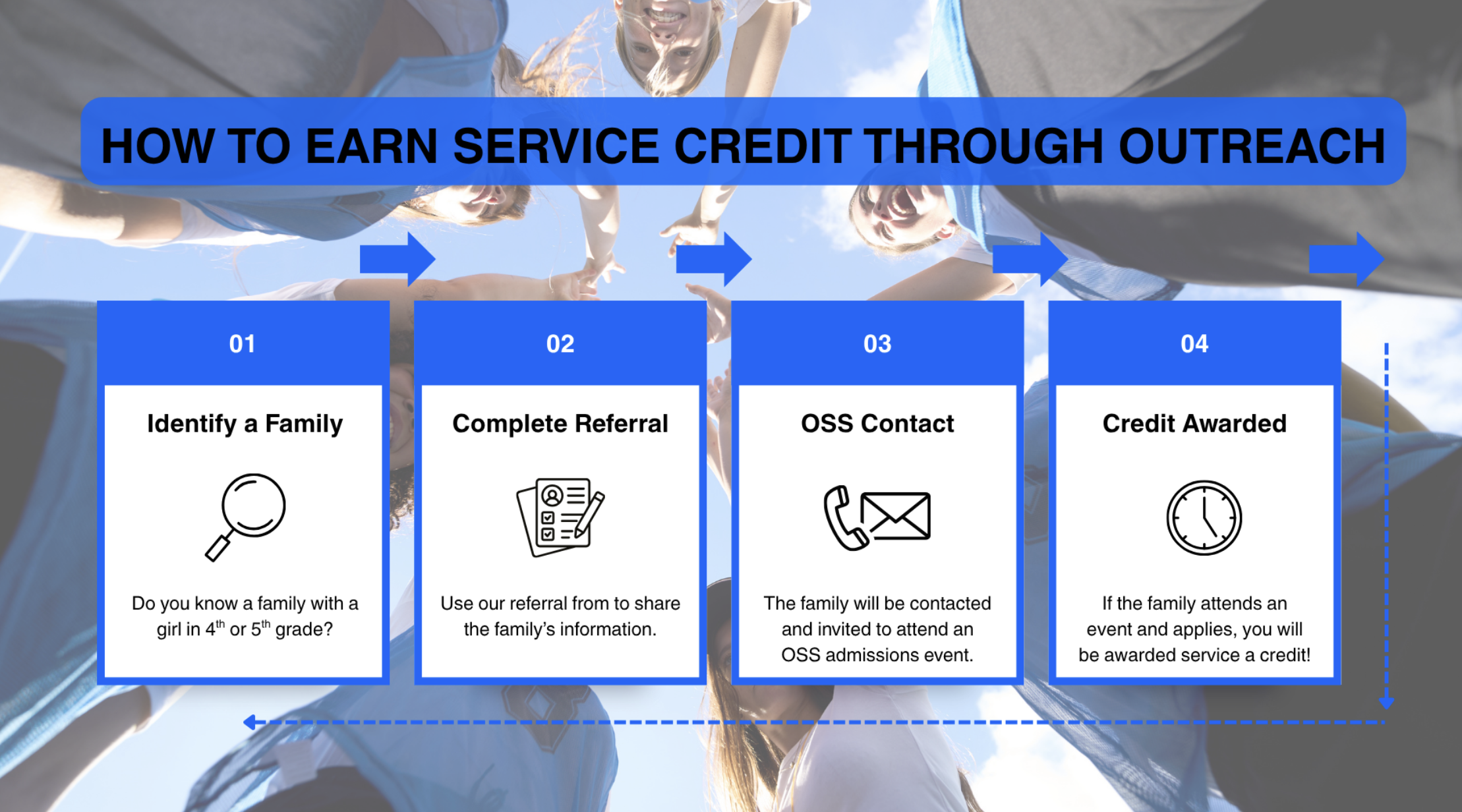 If you refer a family to OSS and they attend an admissions event and complete an application, you can earn a service credit. The more families you refer, the more credits you can earn!