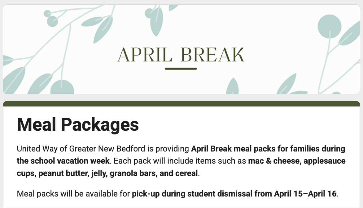 United Way of Greater New Bedford is providing April Break snack packs for families during the school vacation week. Each pack will include items such as mac & cheese, applesauce cups, peanut butter, jelly, granola bars, and cereal. Snack packs will be available for pick-up during student dismissal on April 15–16.