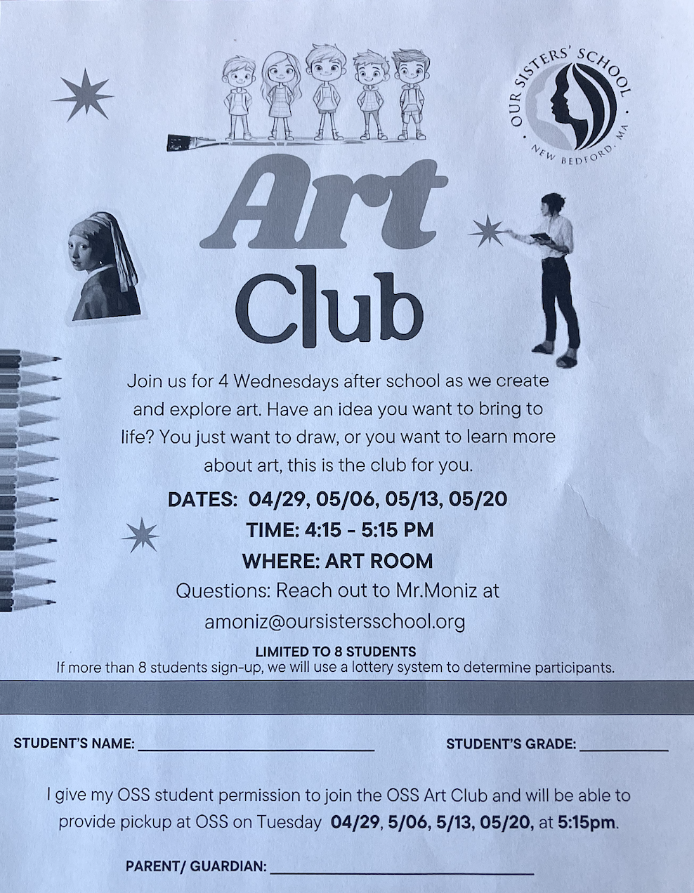 Grade 6 presented their art and skits on Wednesday night. They did an incredible job! Thank you to everyone for all your support in making this possible. Each 6th grader received a year-long membership to the New Bedford Whaling Museum! The work is up through the end of May, so please stop by if you haven’t had a chance to do so yet!
